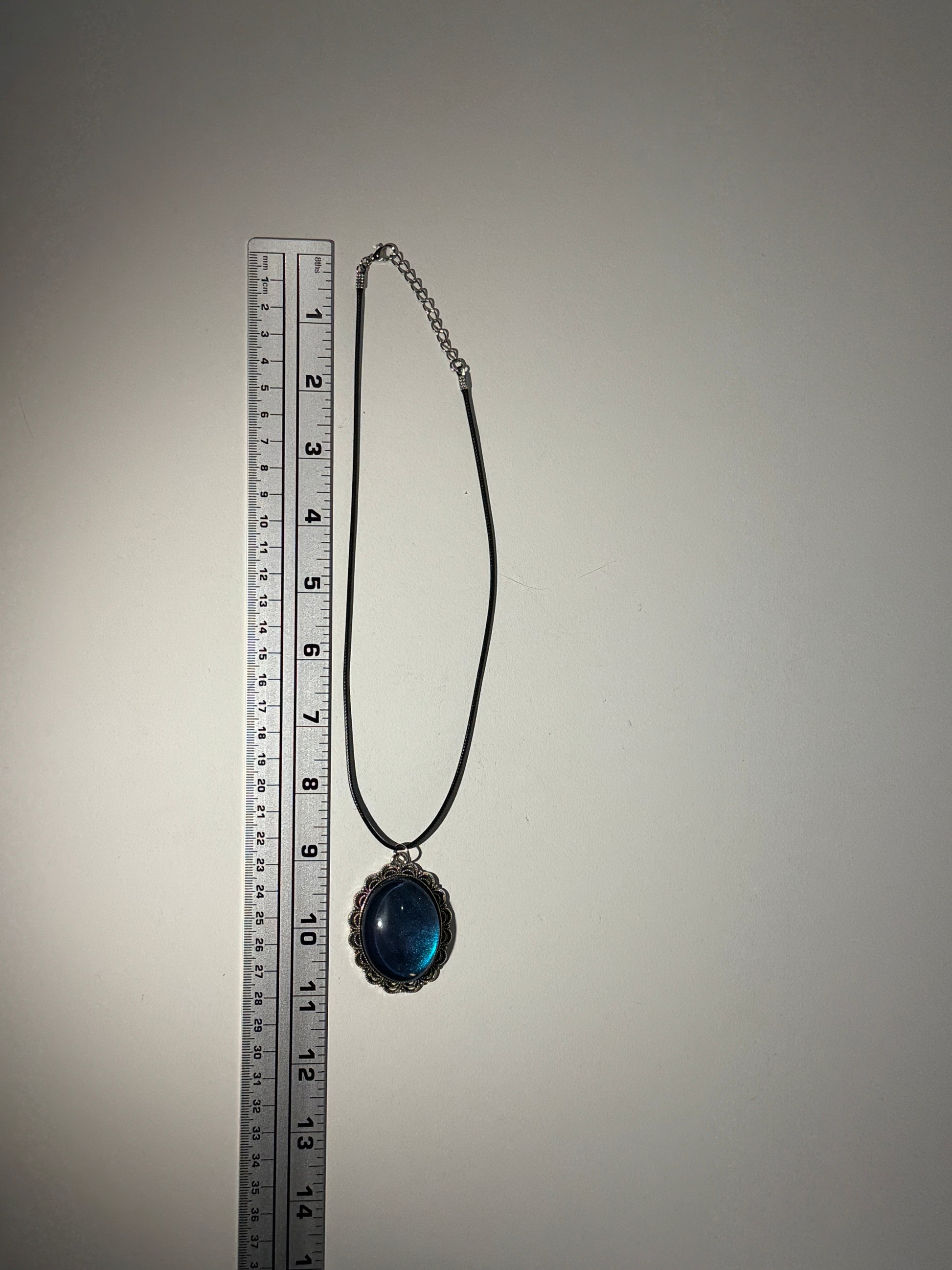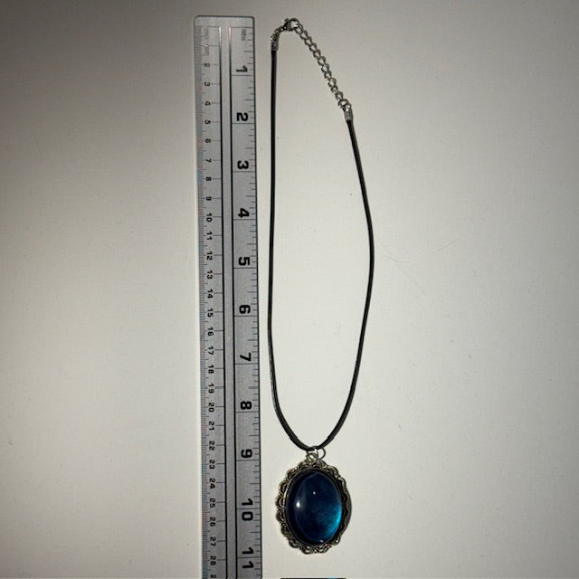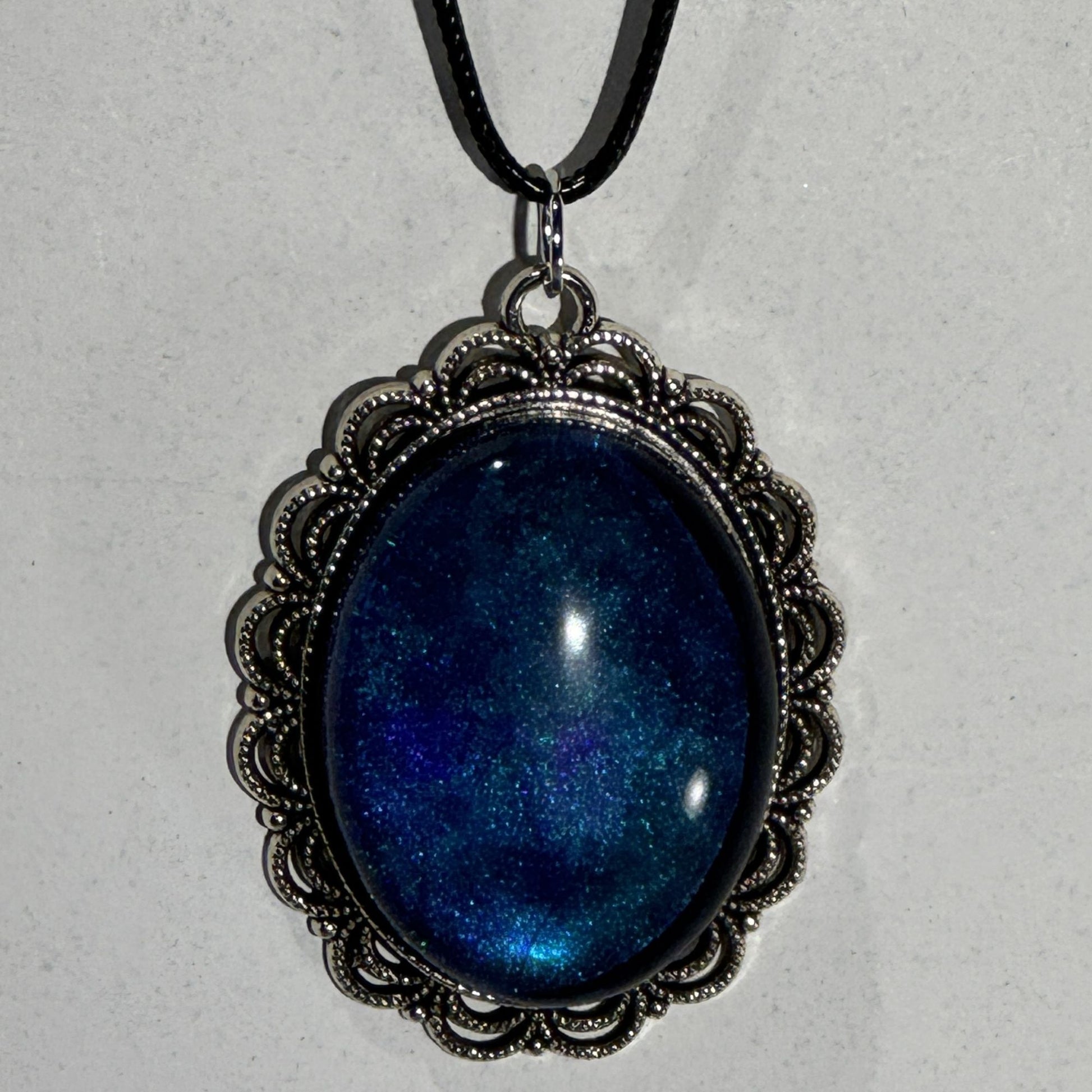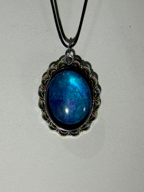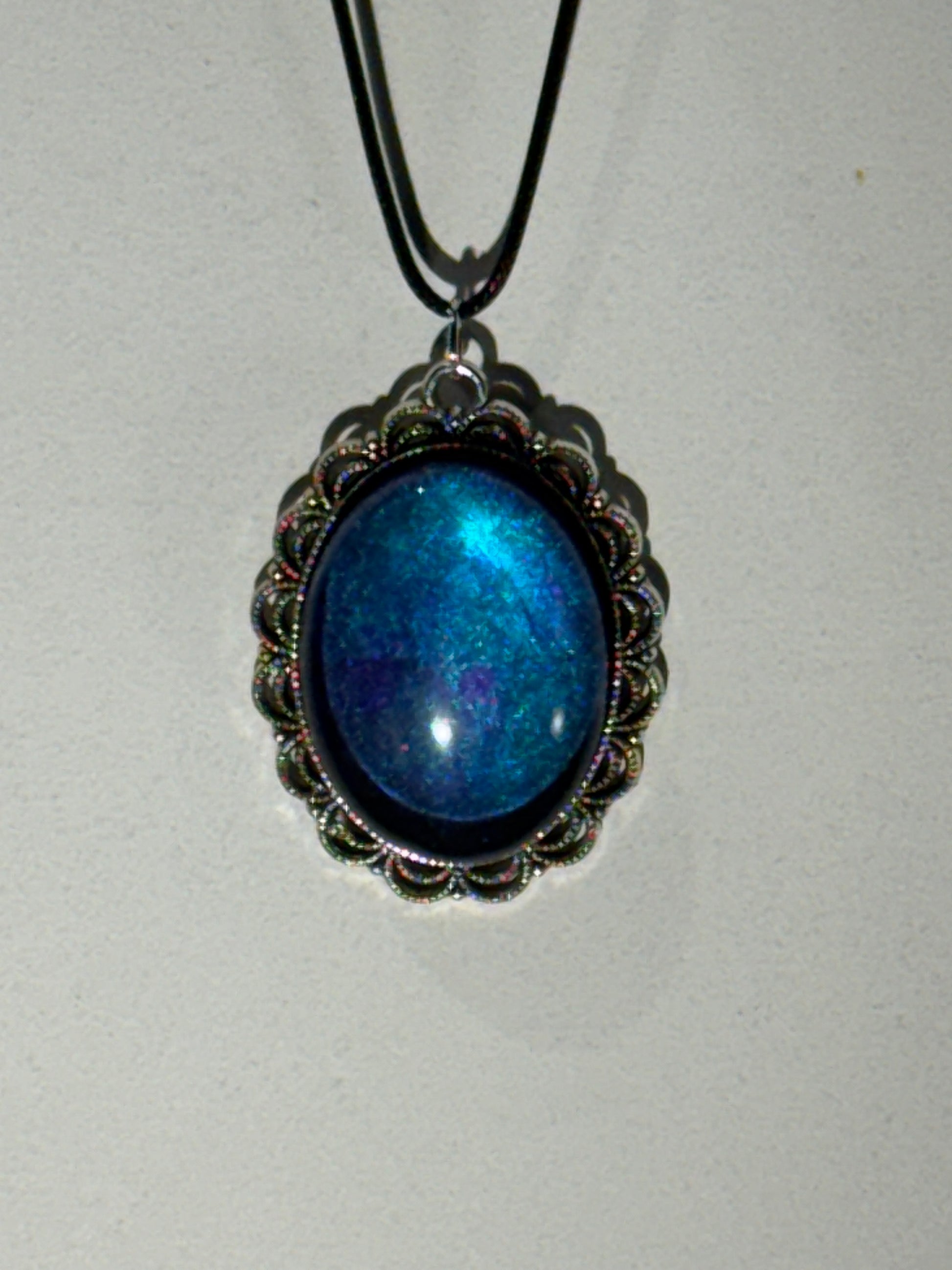 A handcrafted stone with mesmerizing blue, green, and purple highlights shimmers within a polished silver bezel. Suspended on a simple black cord, this necklace captures the beauty of shifting light and timeless design. #6277