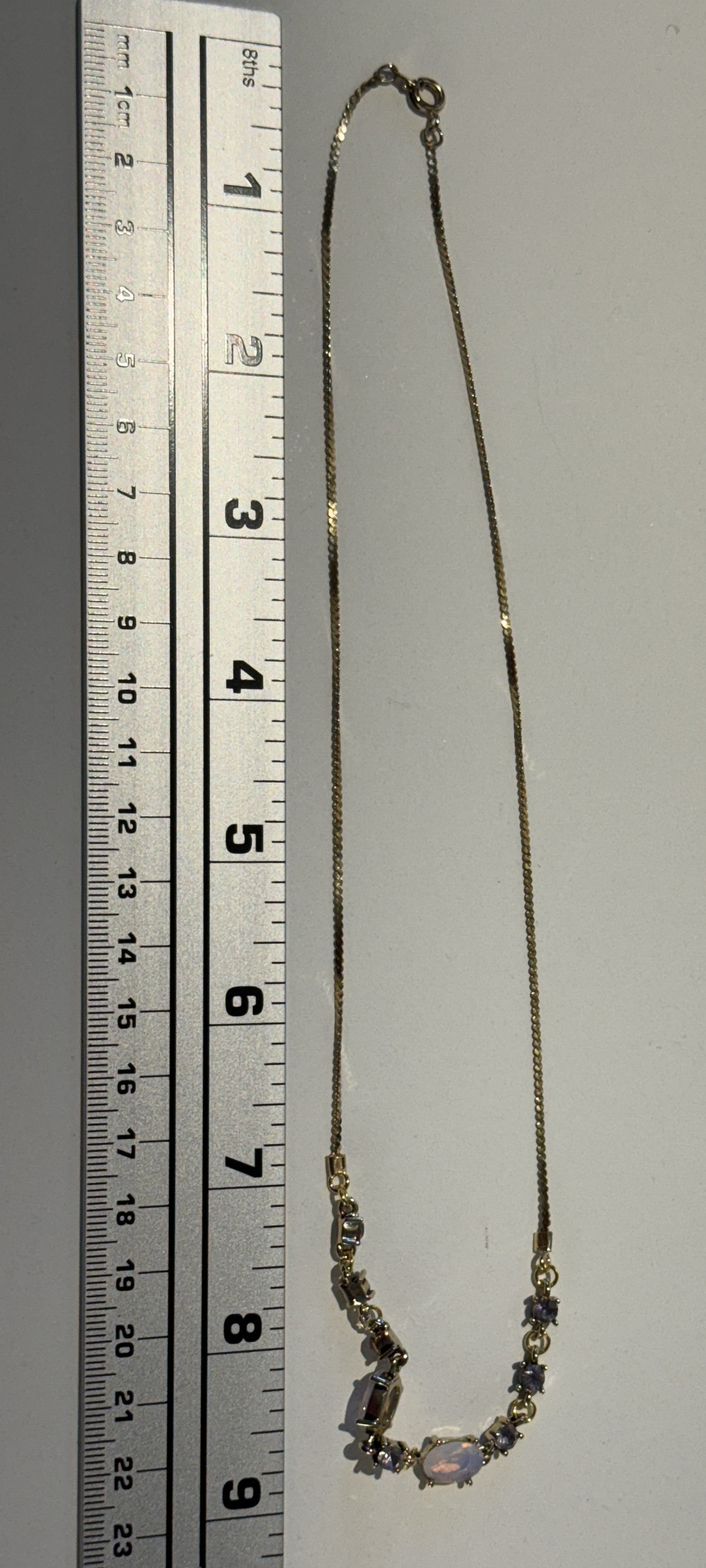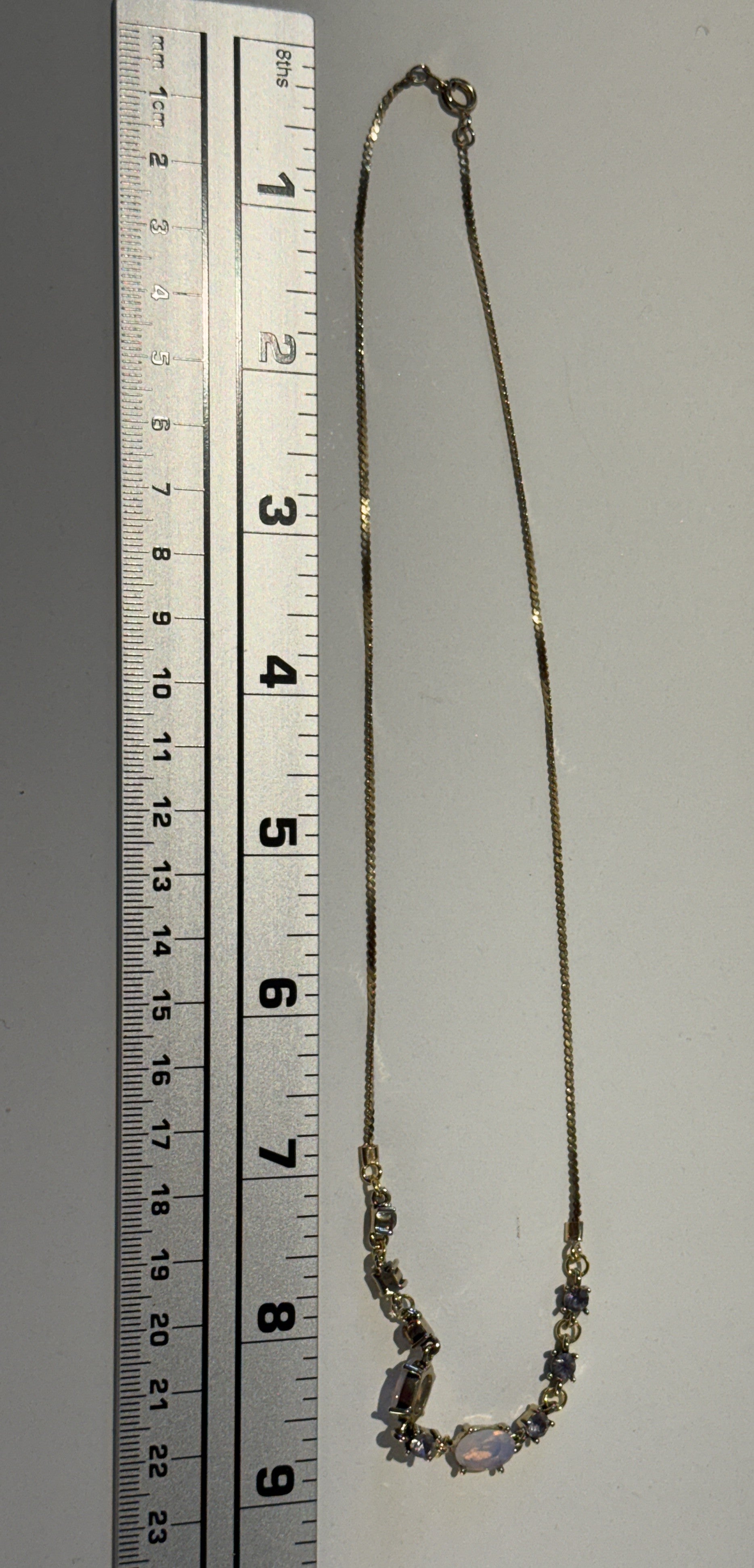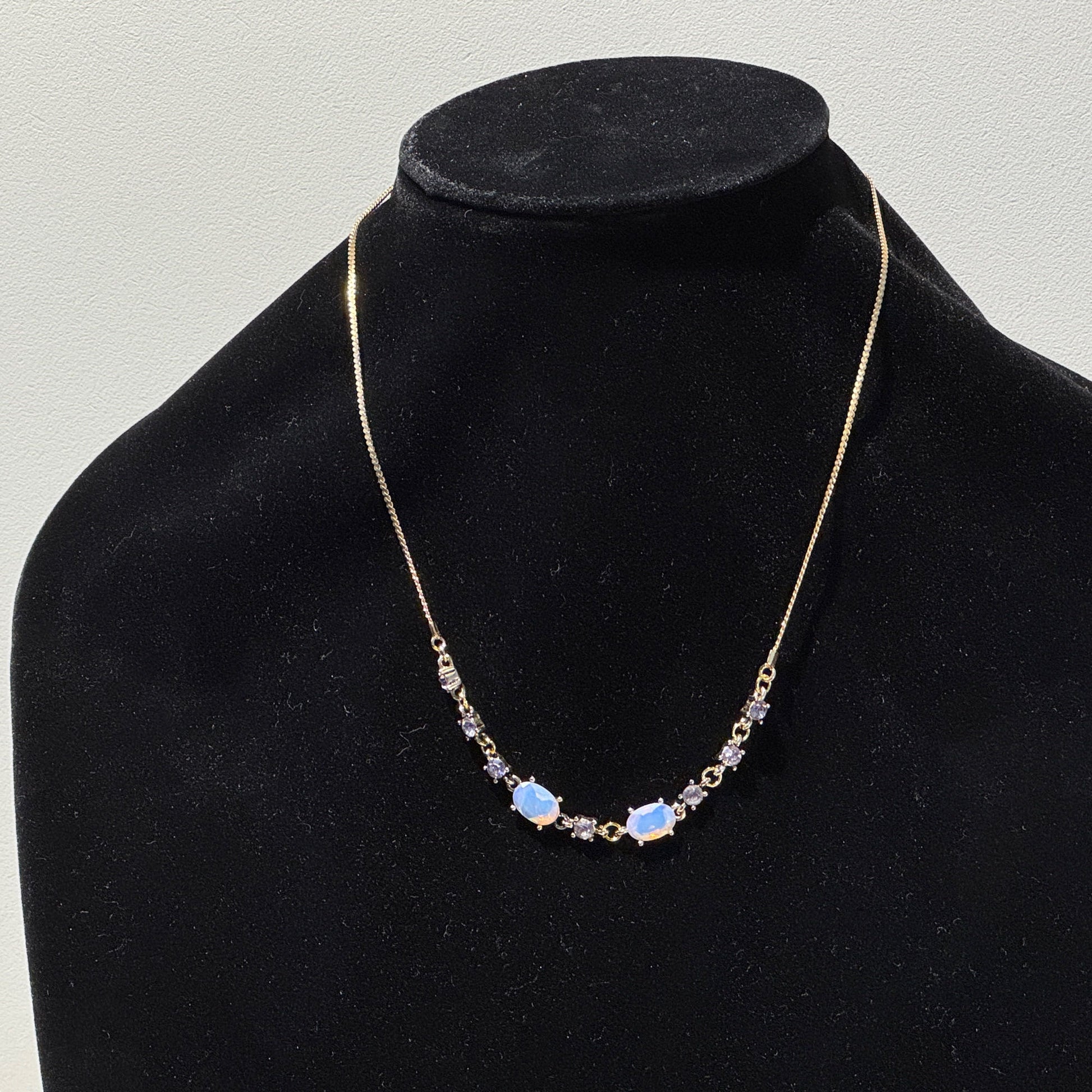 Elegant and luminous, this gold-tone necklace features two opal-look stones beautifully framed by sparkling glass crystals on a delicate chain. A refined piece that adds just the right touch of shimmer to any outfit. One of our Reimagined Vintage Collection. #6256
