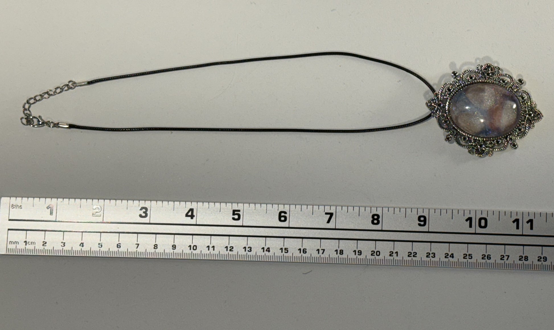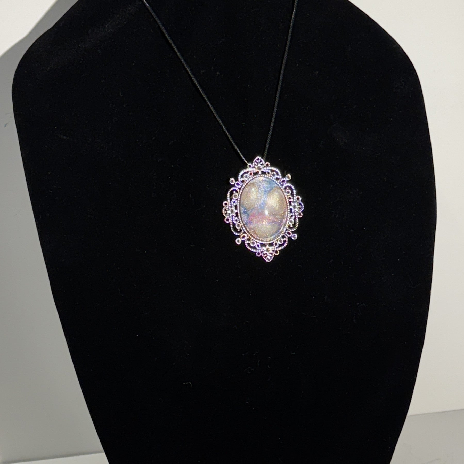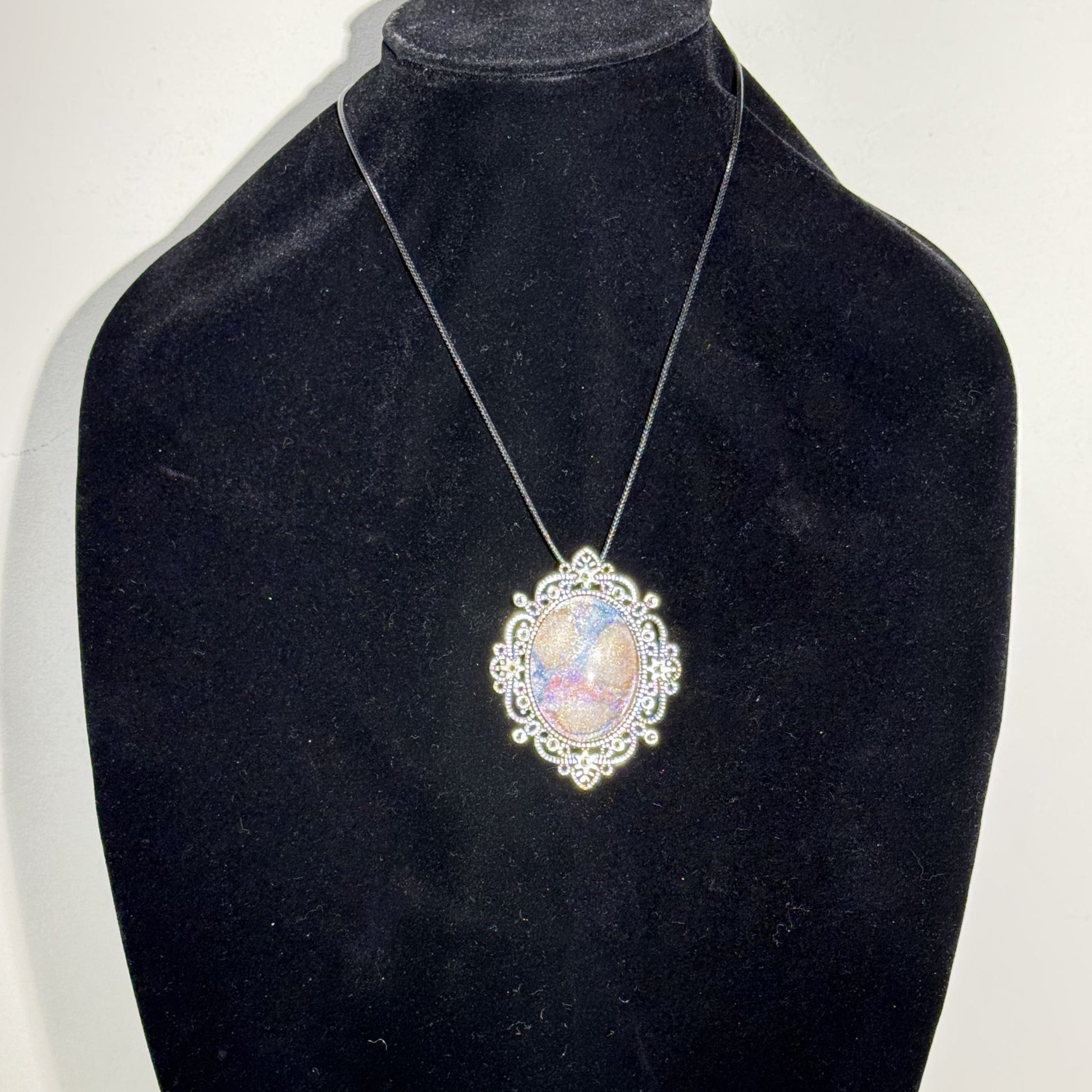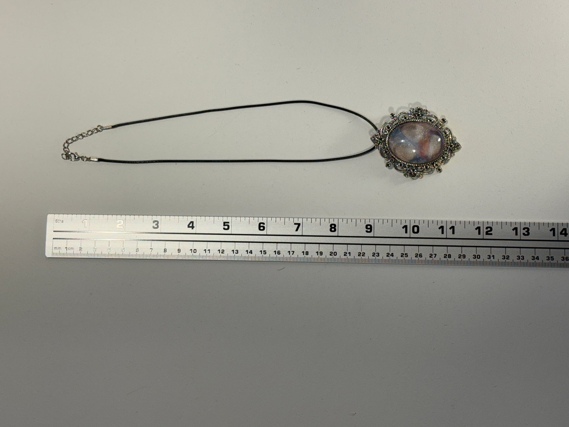 A luminous handcrafted moonstone, framed in a sleek silver tone bezel, hangs gracefully from a simple black cord. Effortlessly elegant, this piece blends natural beauty with timeless design. #6276