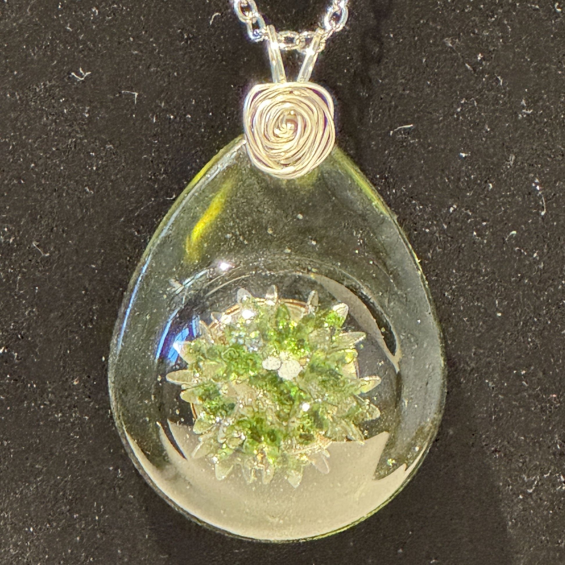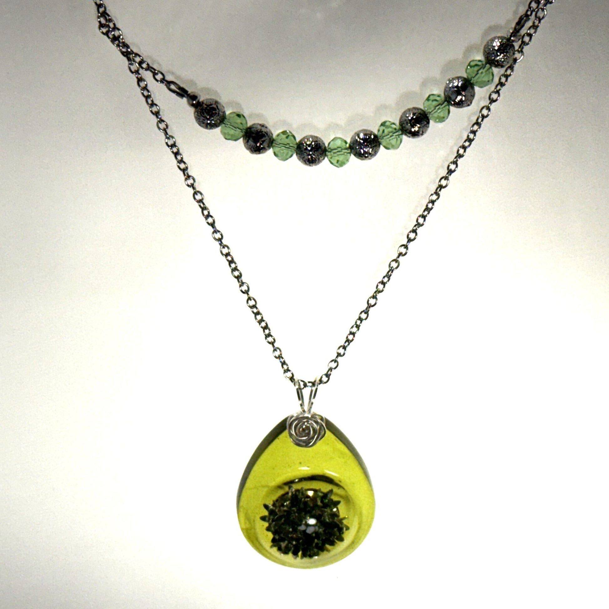 This mixed metal necklace set blends delicate charm with bold artistry. The first piece is a graceful gold-toned chain accented with a single faux pearl, a timeless touch of elegance. The second necklace, a silver-toned chain, features a shimmering bridge of green and silver beads that leads the eye to a handcrafted rose bail. From it hangs a rich green teardrop crowned with a vintage-inspired green and crystal starburst that dazzles with old-world glamour. Worn layered or solo, this set is a stunning statement of reimagined beauty. #6261